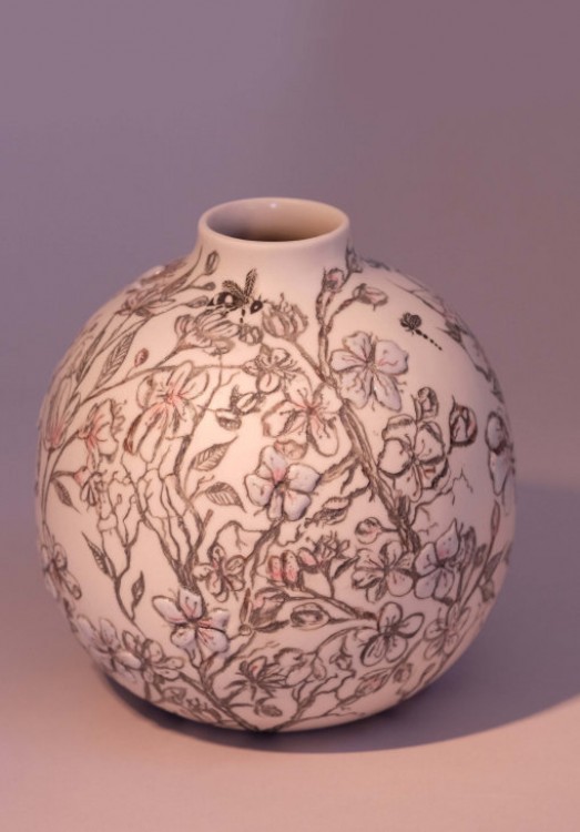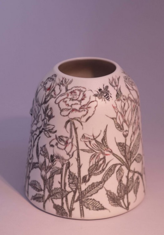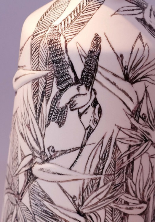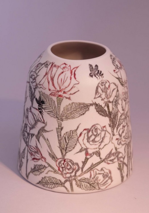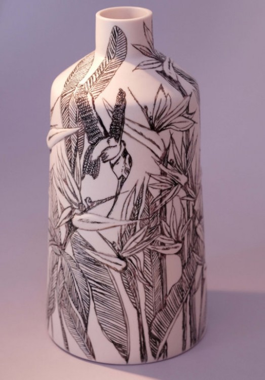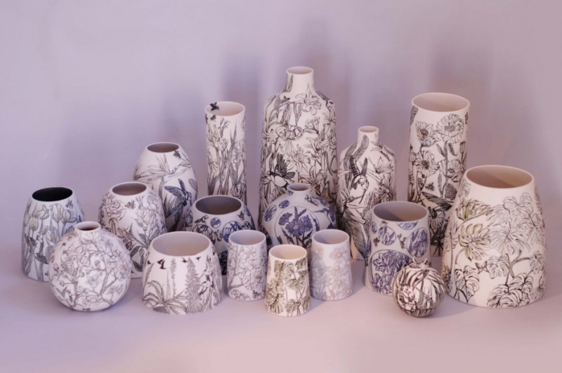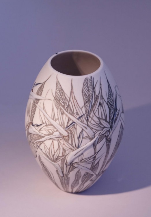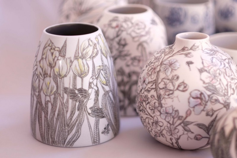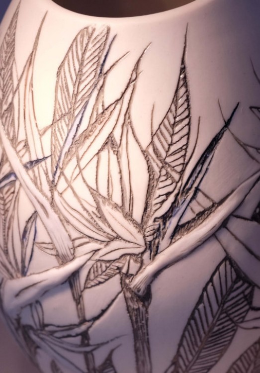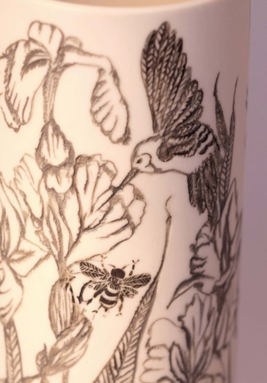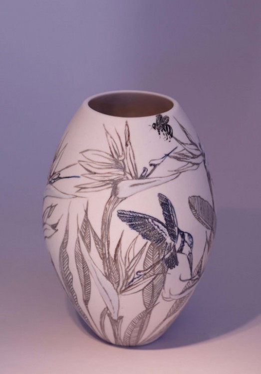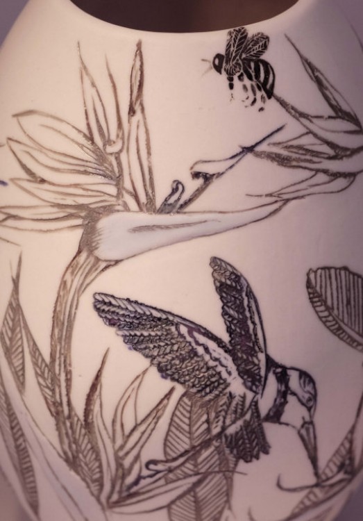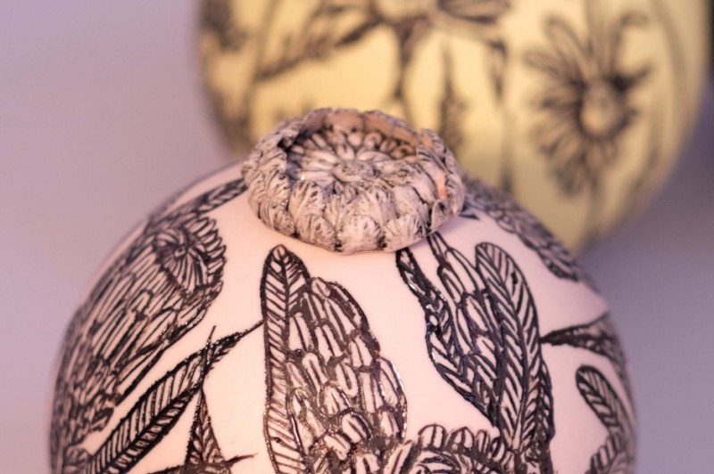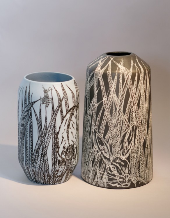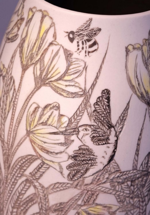 I like to illustrate through "clay etchings" on the form, a world in which small acts of everyday life reveals itself in fine detail.